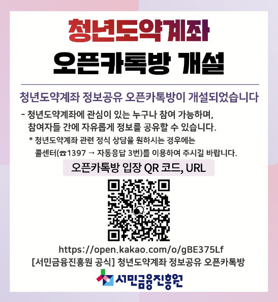 청년도약계좌 오픈카톡방이 개설되었다고 해요. 큐알코드를 찍으셔도 아래 링크버튼을 누르시면 바로 오픈채팅방으로 이동 하실 수 있습니다.